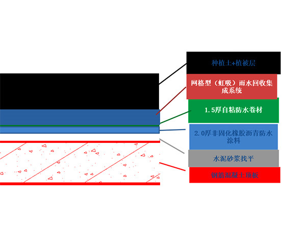 異形虹吸排水管和蓄排水防護(hù)收集系統(tǒng)通過高分子自愈密閉膠膜防水密閉粘結(jié),在種植頂板上形成完整密封的排水面,所有的雨水都在溝渠式排水板上面流動(dòng),相當(dāng)于在防水層上做了一道既能排水又能降低防水層水壓、防止竄水的軟保護(hù)層;系統(tǒng)利用土層滲水壓力差原理,通過拱橋雨水收集板與溝渠的高低落差收集雨水,縱橫向溝渠和透氣減壓效果的異形雨水收集營造出有組織的地下排水通道。