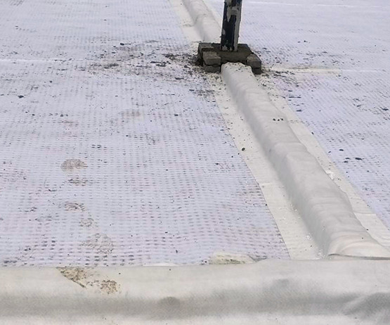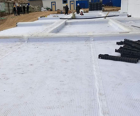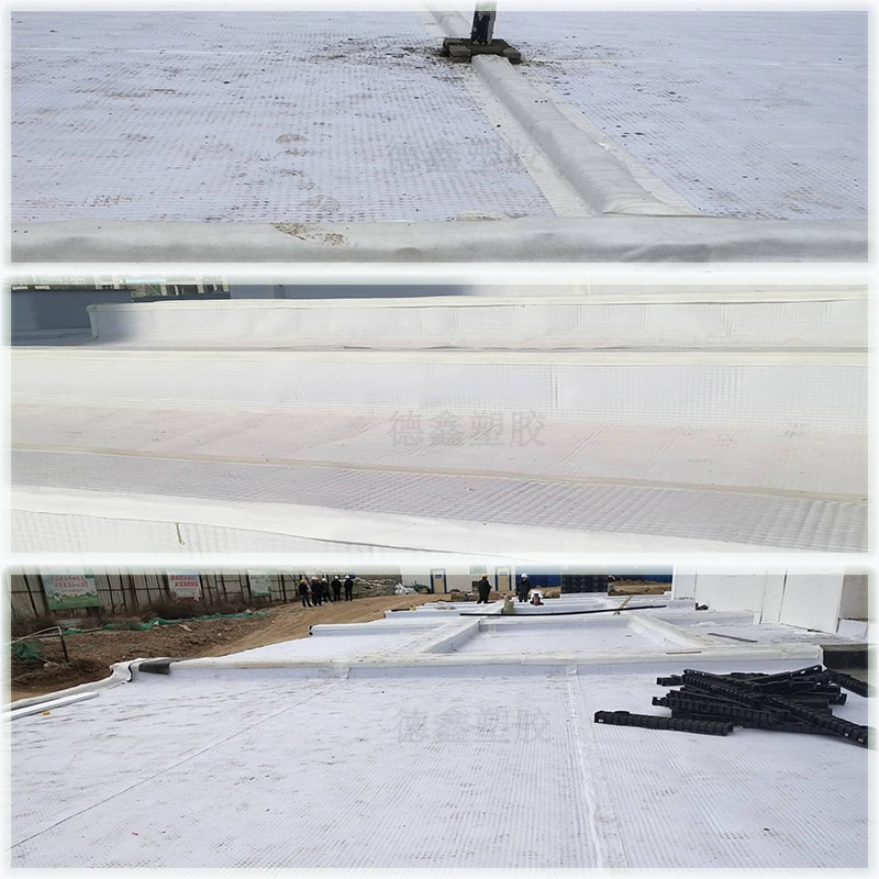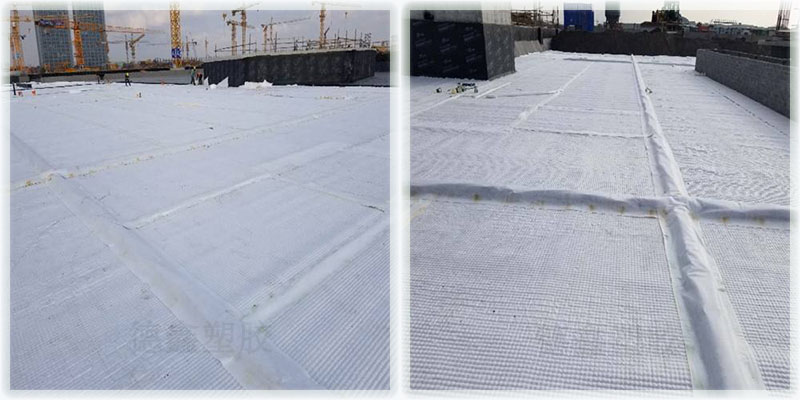 在整個(gè)車(chē)庫(kù)頂板虹吸雨水排水系統(tǒng)中,高分子異形片滿(mǎn)鋪在防水層上,承受車(chē)庫(kù)靜水壓,同時(shí)起到將水疏導(dǎo)到排水槽內(nèi)的作用,高分子異形片相當(dāng)于防水層的柔性保護(hù)層,起到耐根穿刺作用。